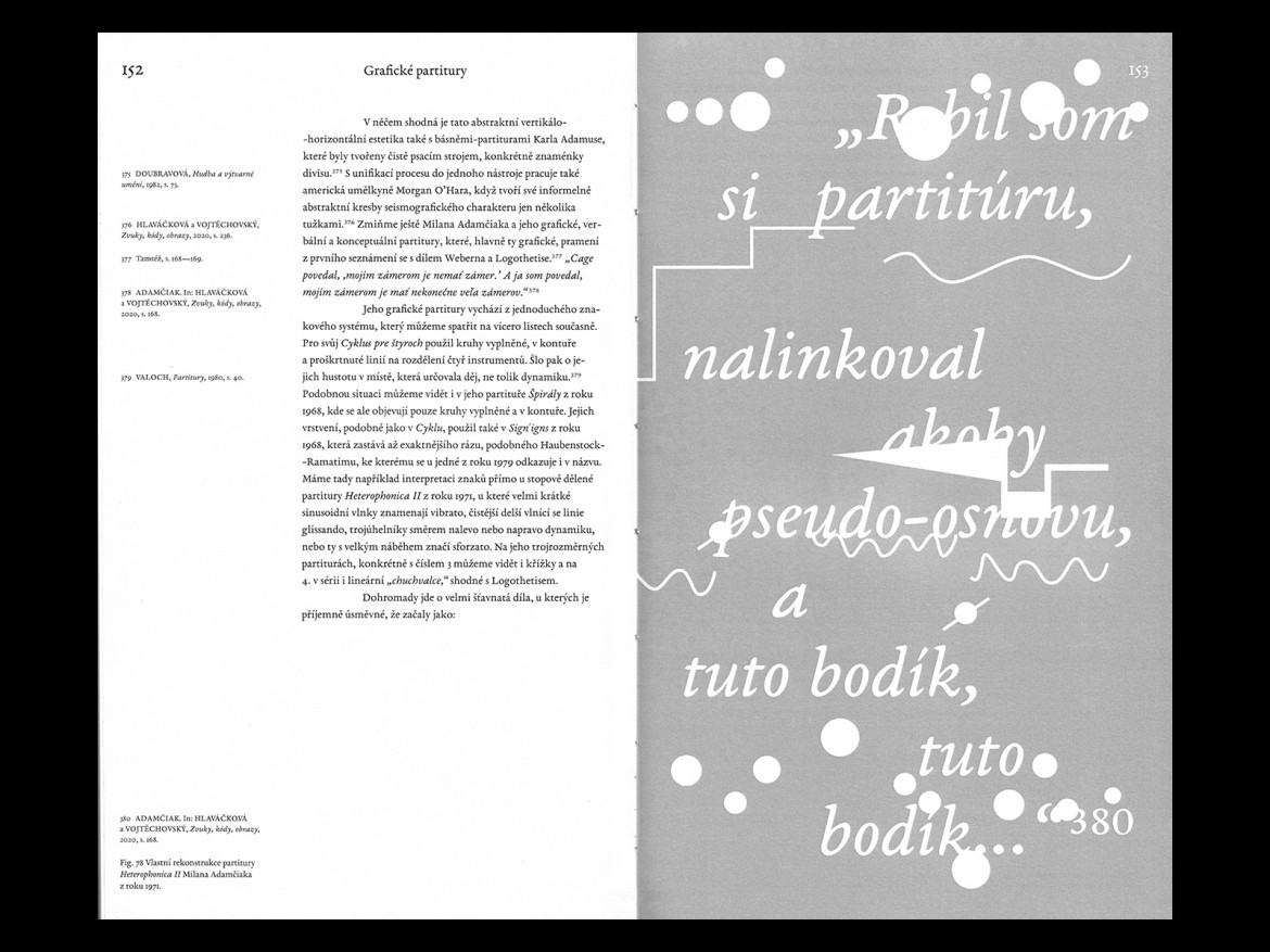 Książka pt. Formy dźwiękowe (Sound Forms, Zvukové formy) bada historyczne dążenie do wizualizacji i notacji dźwięku oraz przypisywania mu kolorów i kształtów. Od Arystotelesa, przez figury dźwiękowe Ernsta Chladniego, analizy muzyczne i teorie Wassily’ego Kandinsky’ego, kolorowe pianino Zdenka Pešánka i inne wynalazki, aż po współczesne oprogramowanie cyfrowe i twórców audiowizualnych, projekt śledzi drogę prowadzącą do zapisów graficznych, które przedstawia głównie od początku XX wieku do czasów współczesnych. Książka kończy się typologią kształtów spotykanych w zapisach graficznych i eksperymentalnych – katalogiem zidentyfikowanych grafemów, opatrzonych nazwiskiem autora, tytułem utworu i datą powstania. W całej publikacji znajdują się kody QR prowadzące do przykładów muzycznych, które wraz ze wstawionymi przezroczystymi kartami tworzą niemal interaktywne doświadczenie. Publikacja opiera się na oryginalnych tekstach stanowiących część teoretyczną pracy licencjackiej.