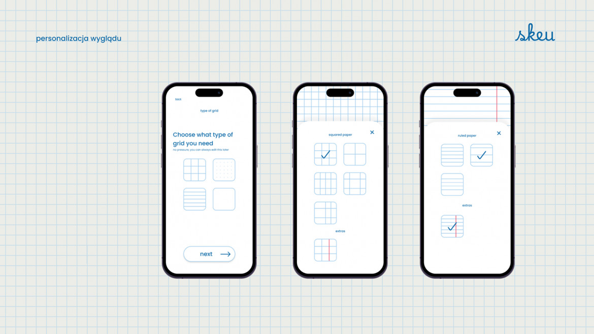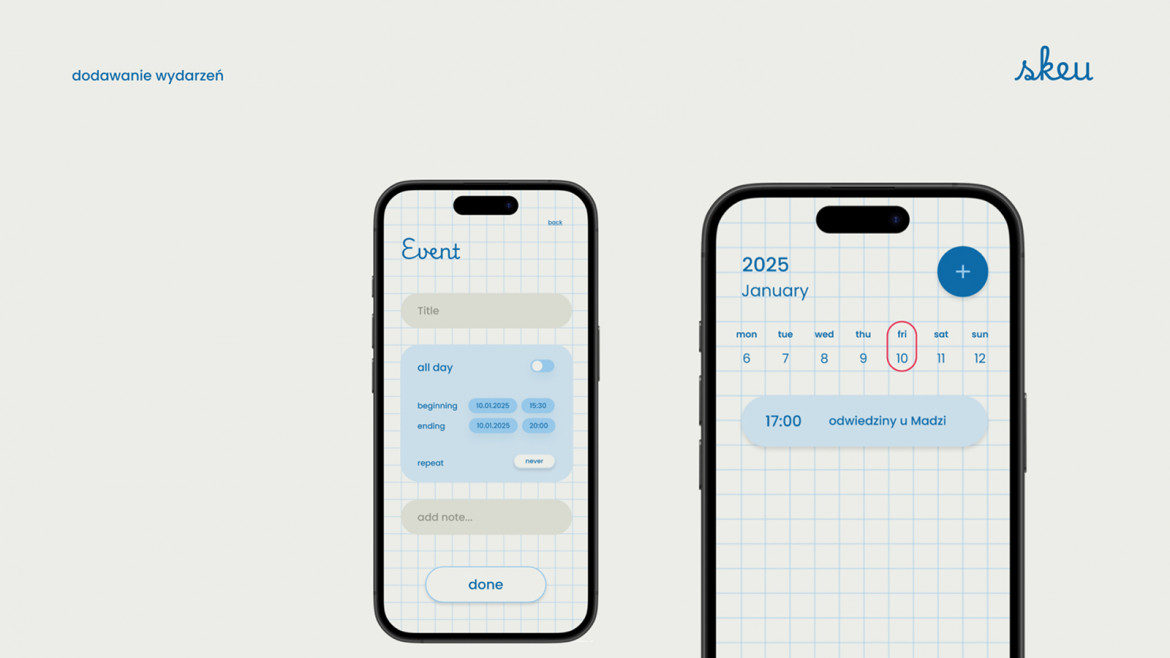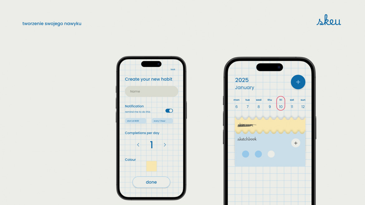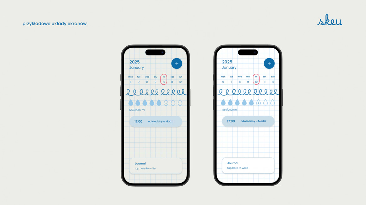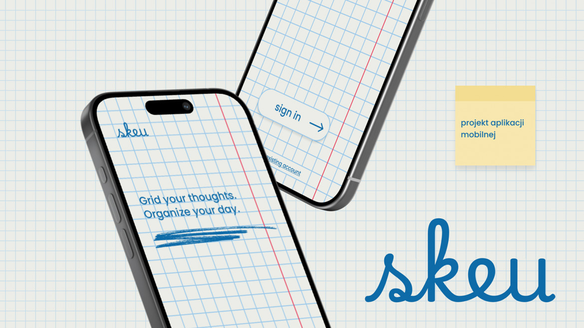 Skeu to projekt aplikacji mobilnej, której głównym celem jest stworzenie wygodnego i estetycznego narzędzia do planowania dnia. Punktem wyjścia było doświadczenie zakupów w sklepie papierniczym i wybór tego jednego, idealnego zeszytu. Przeprowadzona analiza dała autorce pogląd na to, jak duża grupa kupujących docenia detale w codziennym życiu. Problemem jednak okazała się forma – ponieważ wiele osób nie lubi na co dzień nosić ciężkiego plannera, pojawiła się myśl o stworzeniu aplikacji. Porównania z innymi mobilnymi narzędziami dały autorce jasny sygnał, że projekt powinien dostosowywać się do użytkownika zarówno wizualnie, jak i funkcjonalnie.