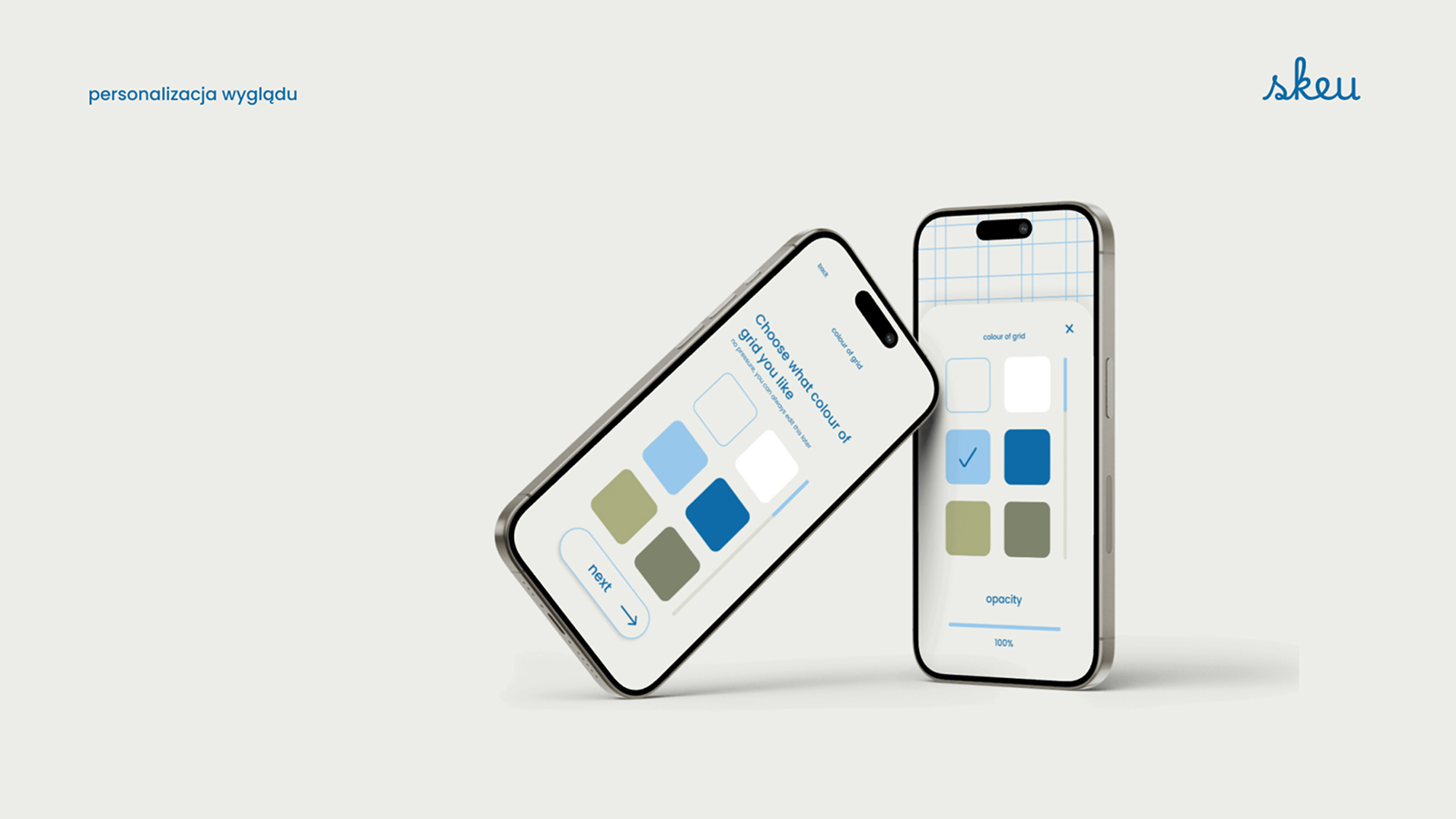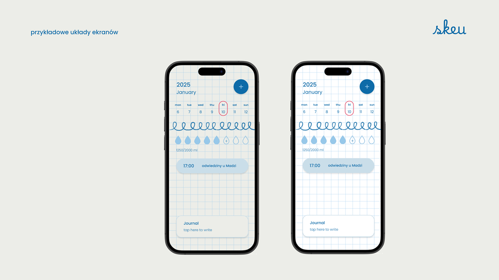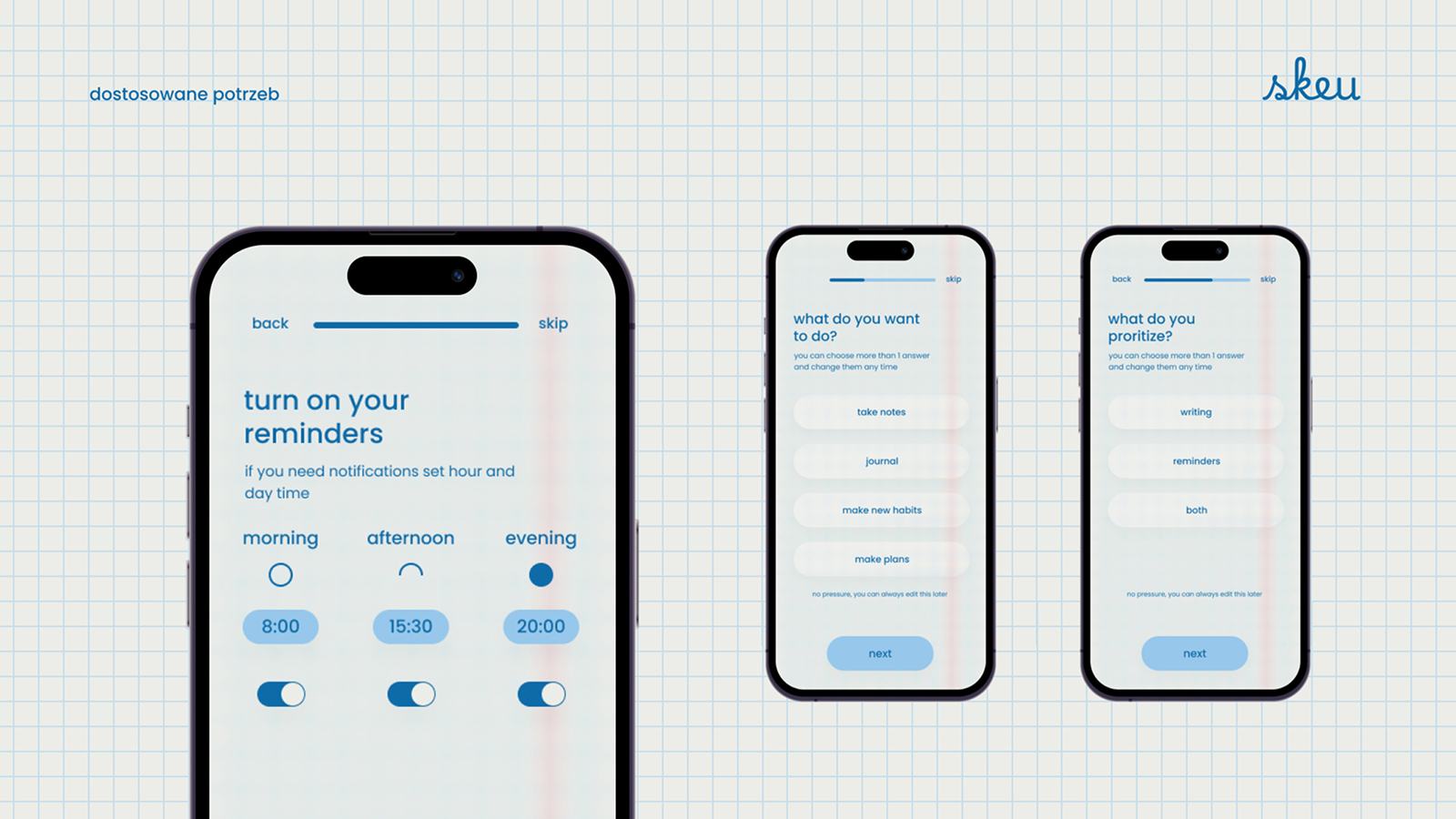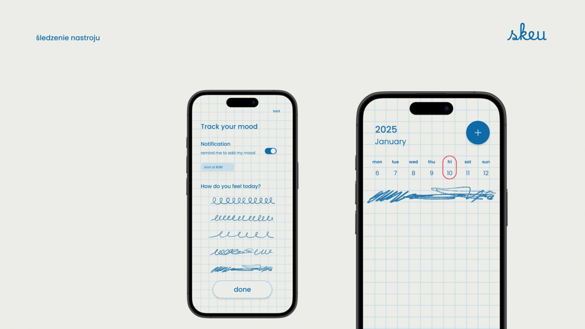 Skeu to projekt aplikacji mobilnej, której głównym celem jest stworzenie wygodnego i estetycznego narzędzia do planowania dnia. Punktem wyjścia było doświadczenie zakupów w sklepie papierniczym i wybór tego jednego, idealnego zeszytu. Przeprowadzona analiza dała autorce pogląd na to, jak duża grupa kupujących docenia detale w codziennym życiu. Problemem jednak okazała się forma – ponieważ wiele osób nie lubi na co dzień nosić ciężkiego plannera, pojawiła się myśl o stworzeniu aplikacji. Porównania z innymi mobilnymi narzędziami dały autorce jasny sygnał, że projekt powinien dostosowywać się do użytkownika zarówno wizualnie, jak i funkcjonalnie.