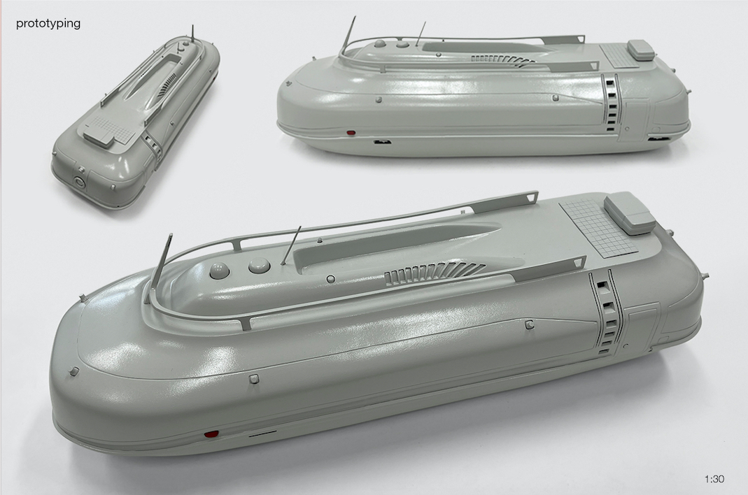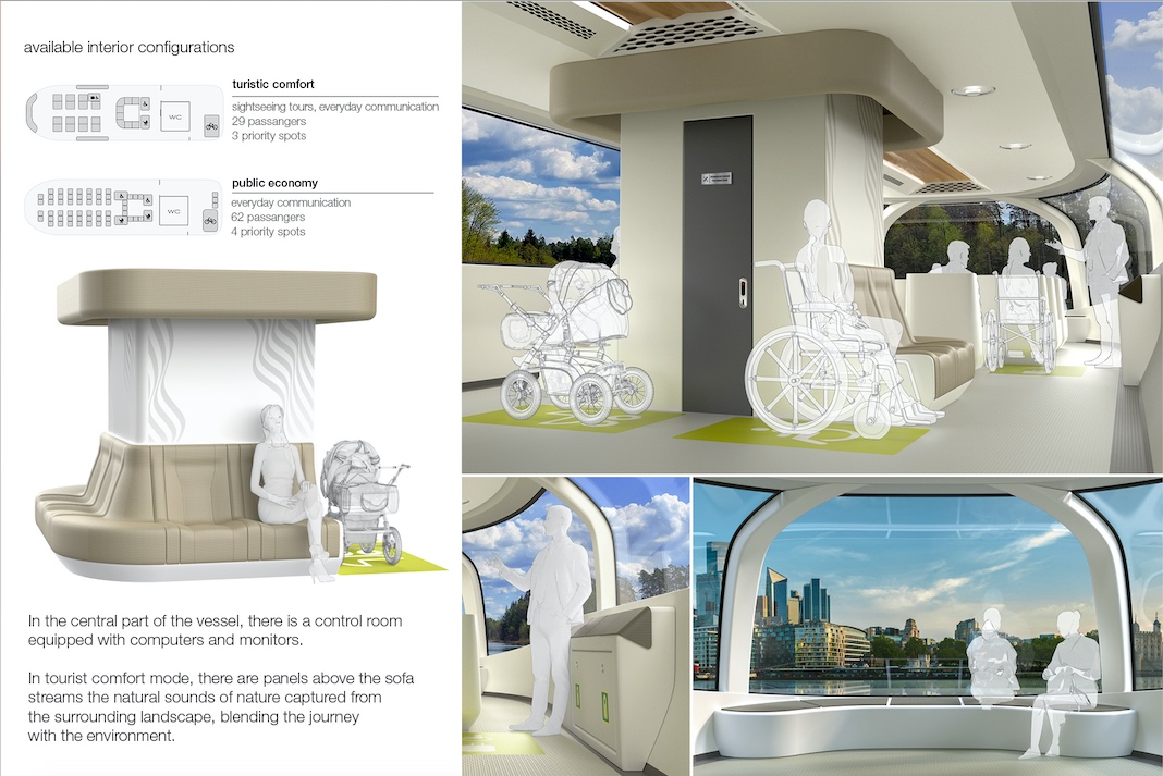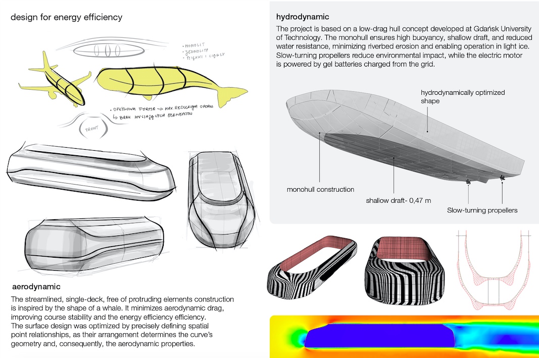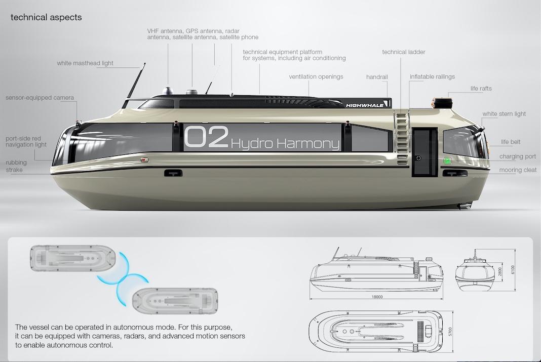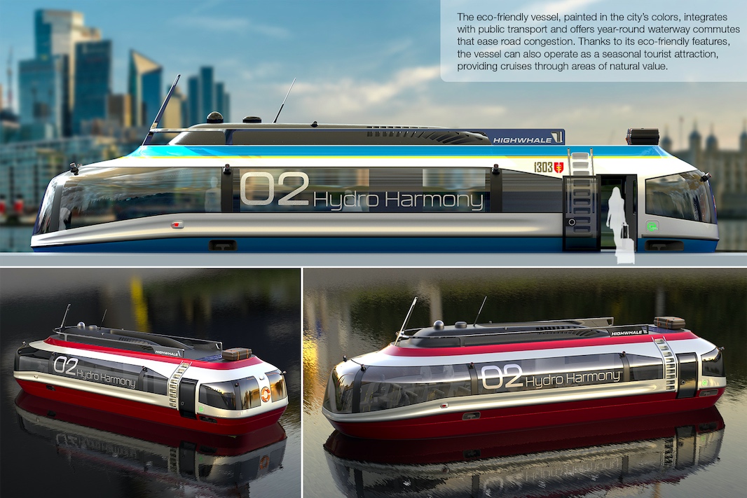 „Highwhale” to nowoczesny elektryczny prom pasażerski, który odpowiada na potrzebę modernizacji floty śródlądowej. Podkreśla niewykorzystany potencjał dróg wodnych, mogących odciążyć zatłoczone trasy lądowe. Sylwetka statku, inspirowana kształtem wieloryba, optymalizuje zużycie energii. Jednopokładowa, opływowa bryła o jednolitej formie ogranicza opory powietrza. Geometria powierzchni poprawia aerodynamikę, stabilność kursu oraz efektywność energetyczną. W celu redukcji masy wewnętrzna konstrukcja wykorzystuje lekkie i wytrzymałe płyty typu honeycomb. Niskie zanurzenie oraz wolnoobrotowe pędniki ograniczają wpływ na ekosystem wodny, jak również minimalizują erozję dna i brzegów. Jednokadłubowa konstrukcja umożliwia wygodne rozmieszczenie instalacji elektrycznej i akumulatorów oraz eksploatację także w warunkach lekkiego zalodzenia. Statek jest w stanie działać autonomicznie dzięki kamerom, radarom i czujnikom. Może funkcjonować w komunikacji miejskiej i międzymiastowej lub jako jednostka turystyczna, oferując bezemisyjne rejsy po obszarach cennych przyrodniczo.