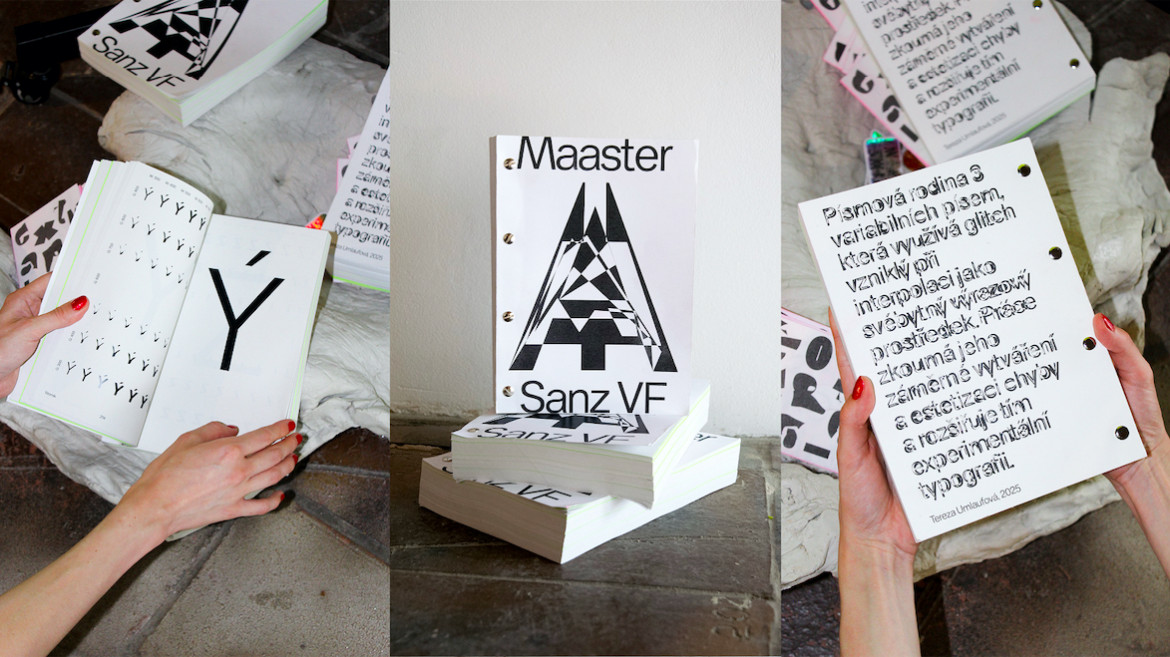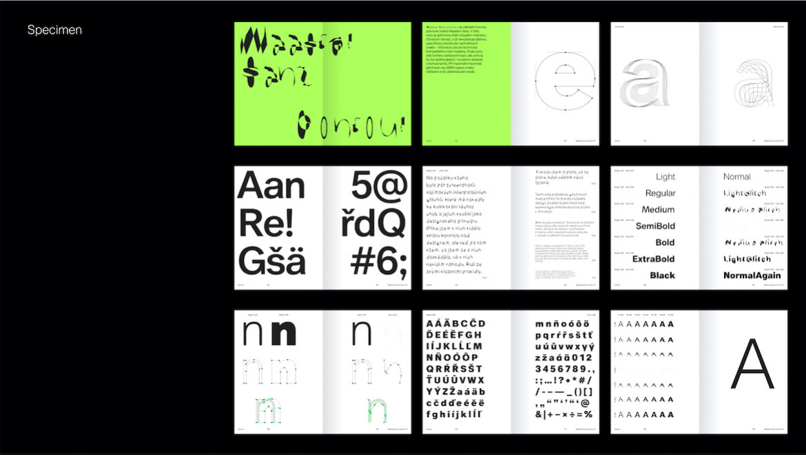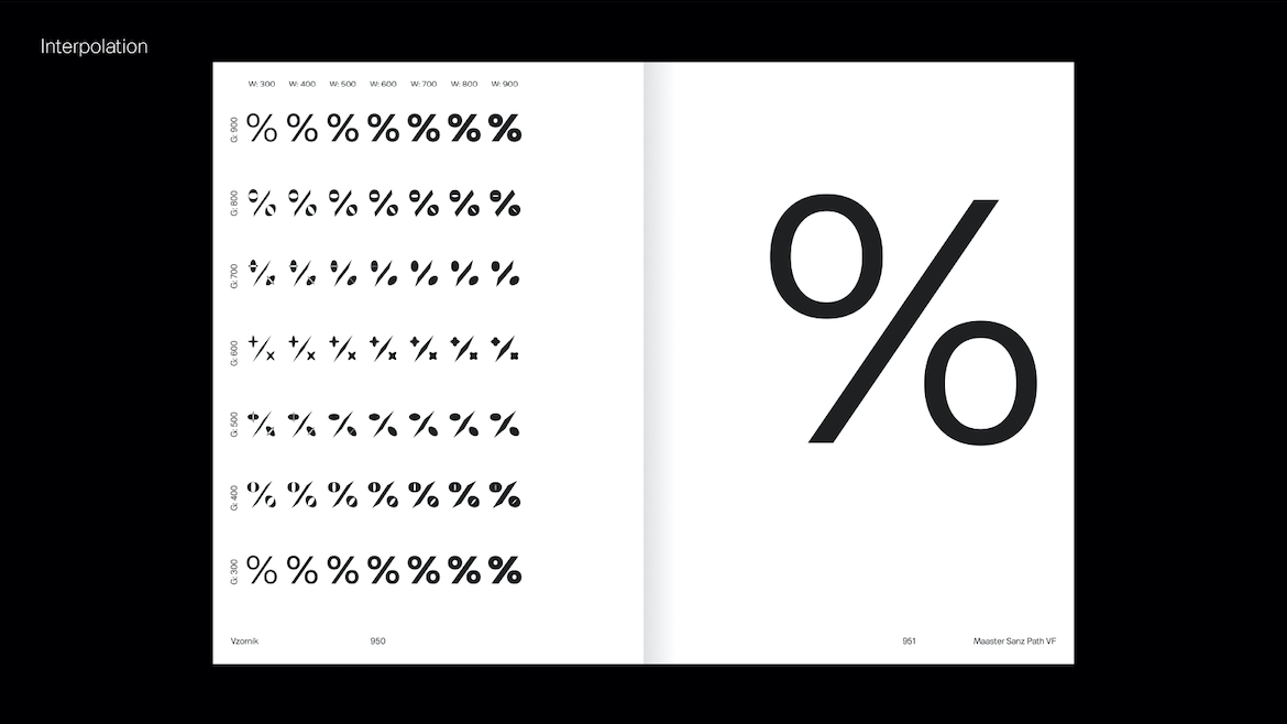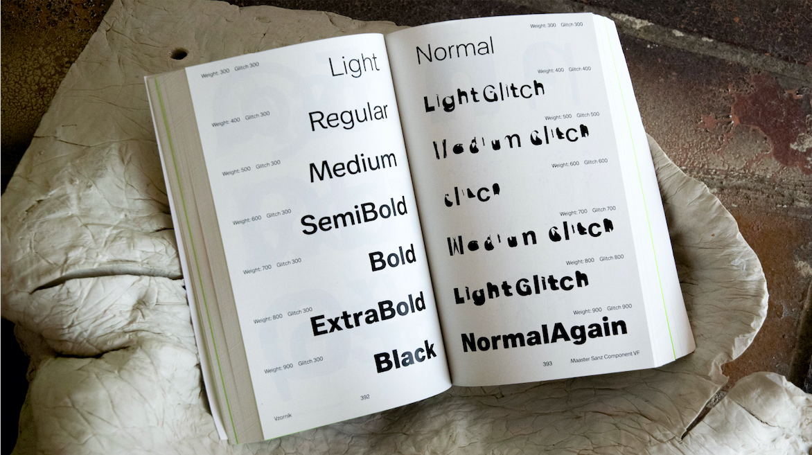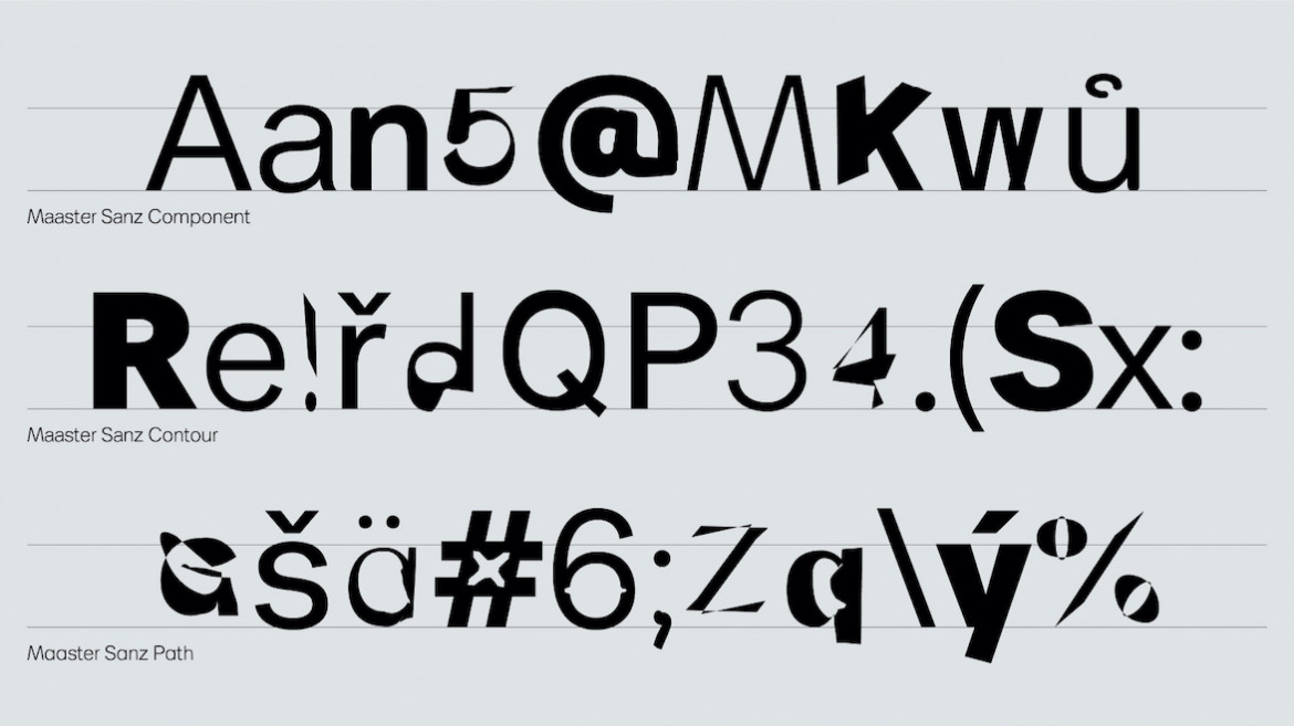 Maaster Sanz to rodzina czcionek zmiennych, w ramach której badane są celowe niepowodzenia interpolacji oraz różnorodność zdeformowanych kształtów liter. Składa się z trzech odrębnych stylów, kontrolowanych przez dwie osie – połączenie konwencjonalnej osi Weight z niekonwencjonalną osią Glitch ukazuje dualność technologii czcionek zmiennych, prezentując zarówno poprawną, jak i celowo niepoprawną interpolację. Projektantka zbadała przyczyny najczęstszych błędów w produkcji krojów pisma, aby opracować i zastosować trzy unikalne, niestandardowe zasady interpolacji wzdłuż osi Glitch. Obejmują one odwrócony kierunek konturów, zmienioną kolejność komponentów oraz niepoprawny kierunek ścieżek, co skutkuje wyraźnymi deformacjami kształtów liter. Proces ten przekształca niestabilny i nieprzewidywalny mechanizm błędu w kontrolowany, generatywny parametr projektowy, umożliwiając eksplorację nietradycyjnych form liter w środowisku zmiennym.